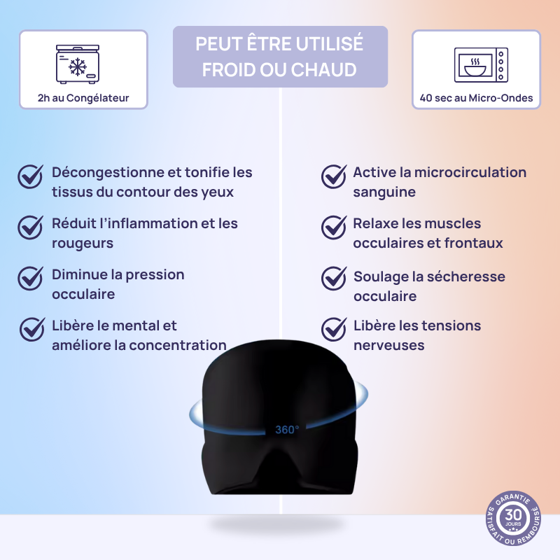 Grâce à sa triple action chaud / froid / compression douce, le Clarity Mask™ aide à soulager les douleurs liées aux migraines, céphalées et tensions oculaires.